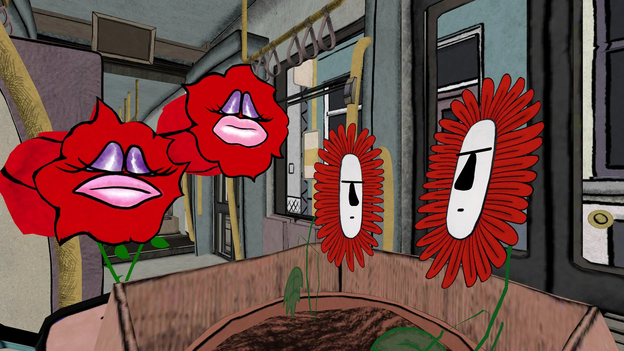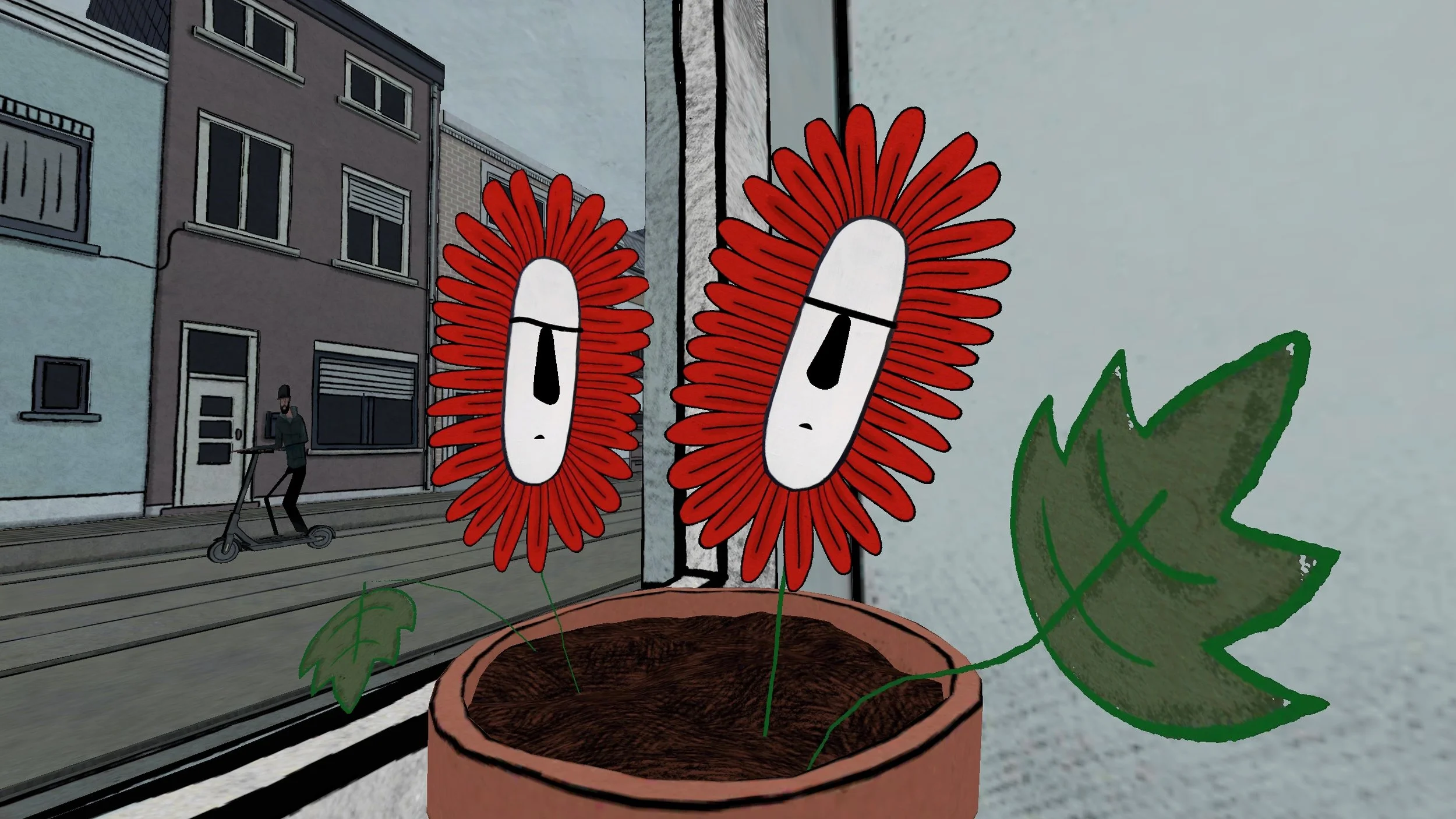 Three moody geraniums take control over their fate and plan their escape from the windowsill they spent their entire boring life on.
